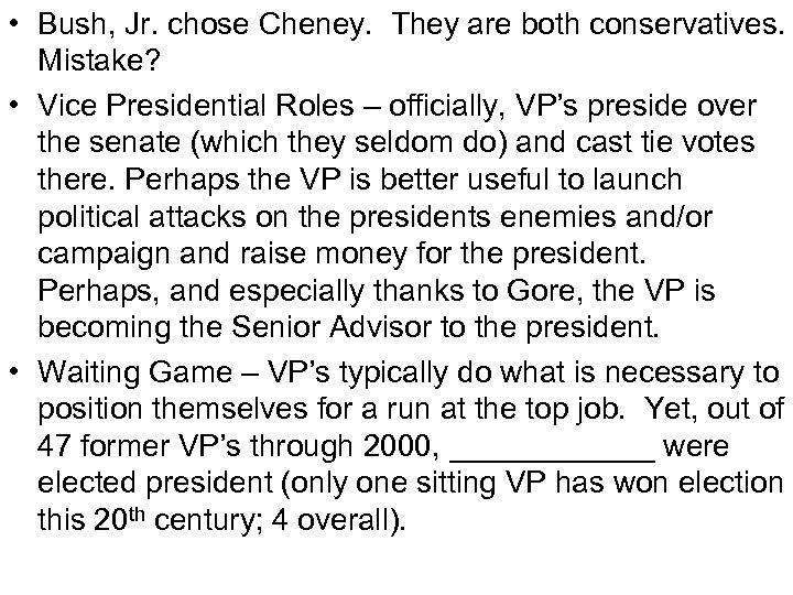 • Bush, Jr. chose Cheney. They are both conservatives. Mistake? • Vice Presidential Roles – officially, VP’s preside over the senate (which they seldom do) and cast tie votes there. Perhaps the VP is better useful to launch political attacks on the presidents enemies and/or campaign and raise money for the president. Perhaps, and especially thanks to Gore, the VP is becoming the Senior Advisor to the president. • Waiting Game – VP’s typically do what is necessary to position themselves for a run at the top job. Yet, out of 47 former VP’s through 2000, ______ were elected president (only one sitting VP has won election this 20 th century; 4 overall).