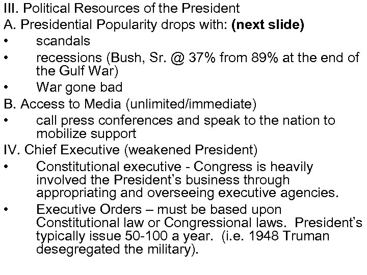 III. Political Resources of the President A. Presidential Popularity drops with: (next slide) • scandals • recessions (Bush, Sr. @ 37% from 89% at the end of the Gulf War) • War gone bad B. Access to Media (unlimited/immediate) • call press conferences and speak to the nation to mobilize support IV. Chief Executive (weakened President) • Constitutional executive - Congress is heavily involved the President’s business through appropriating and overseeing executive agencies. • Executive Orders – must be based upon Constitutional law or Congressional laws. President’s typically issue 50 -100 a year. (i. e. 1948 Truman desegregated the military).