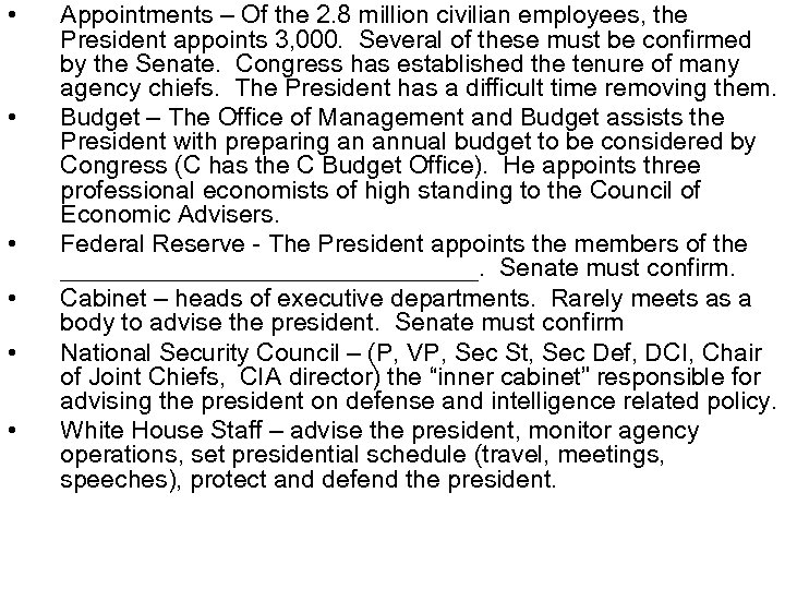 • • • Appointments – Of the 2. 8 million civilian employees, the President appoints 3, 000. Several of these must be confirmed by the Senate. Congress has established the tenure of many agency chiefs. The President has a difficult time removing them. Budget – The Office of Management and Budget assists the President with preparing an annual budget to be considered by Congress (C has the C Budget Office). He appoints three professional economists of high standing to the Council of Economic Advisers. Federal Reserve - The President appoints the members of the _______________. Senate must confirm. Cabinet – heads of executive departments. Rarely meets as a body to advise the president. Senate must confirm National Security Council – (P, VP, Sec St, Sec Def, DCI, Chair of Joint Chiefs, CIA director) the “inner cabinet” responsible for advising the president on defense and intelligence related policy. White House Staff – advise the president, monitor agency operations, set presidential schedule (travel, meetings, speeches), protect and defend the president.