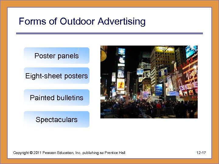 Forms of Outdoor Advertising Poster panels Eight-sheet posters Painted bulletins Spectaculars Copyright © 2011 Pearson Education, Inc. publishing as Prentice Hall 12 -17