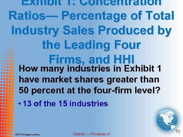 EXHIBIT 1 CONCENTRATION RATIOS—PERCENTAGE OF TOTAL INDUSTRY SALES PRODUCED BY THE LEADING FOUR FIRMS, AND HHI Source: U. S. Bureau of the Census, 2002; Concentration Ratios in Manufacturing, 2004. © 2013 Cengage Learning Gottheil — Principles of 9