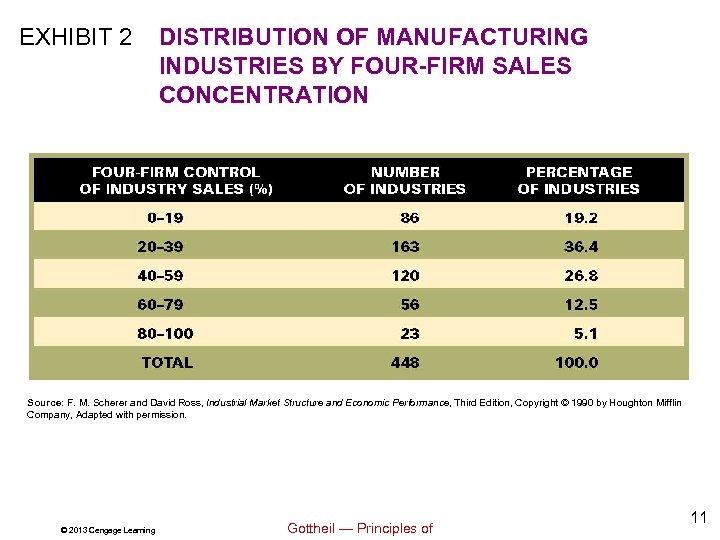 EXHIBIT 2 DISTRIBUTION OF MANUFACTURING INDUSTRIES BY FOUR-FIRM SALES CONCENTRATION Source: F. M. Scherer and David Ross, Industrial Market Structure and Economic Performance, Third Edition, Copyright © 1990 by Houghton Mifflin Company, Adapted with permission. © 2013 Cengage Learning Gottheil — Principles of 11