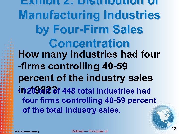 Exhibit 2: Distribution of Manufacturing Industries by Four-Firm Sales Concentration How many industries had four -firms controlling 40 -59 percent of the industry sales in 1982? 448 total industries had • 120 out of four firms controlling 40 -59 percent of the total industry sales. © 2013 Cengage Learning Gottheil — Principles of 12
