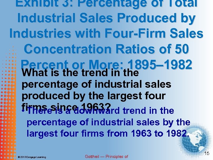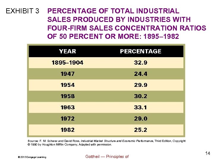 EXHIBIT 3 PERCENTAGE OF TOTAL INDUSTRIAL SALES PRODUCED BY INDUSTRIES WITH FOUR-FIRM SALES CONCENTRATION RATIOS OF 50 PERCENT OR MORE: 1895– 1982 Source: F. M. Scherer and David Ross, Industrial Market Structure and Economic Performance, Third Edition, Copyright © 1990 by Houghton Mifflin Company, Adapted with permission. © 2013 Cengage Learning Gottheil — Principles of 14