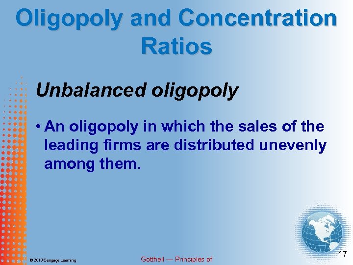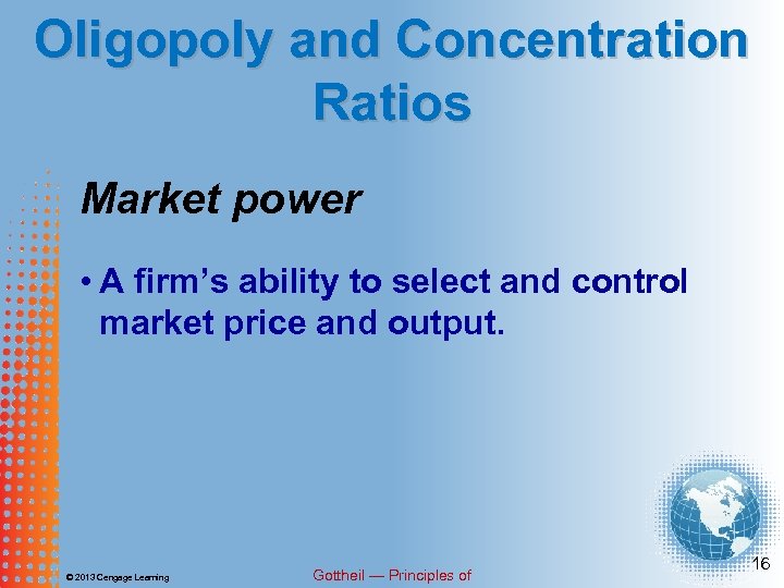 Oligopoly and Concentration Ratios Market power • A firm’s ability to select and control market price and output. © 2013 Cengage Learning Gottheil — Principles of 16