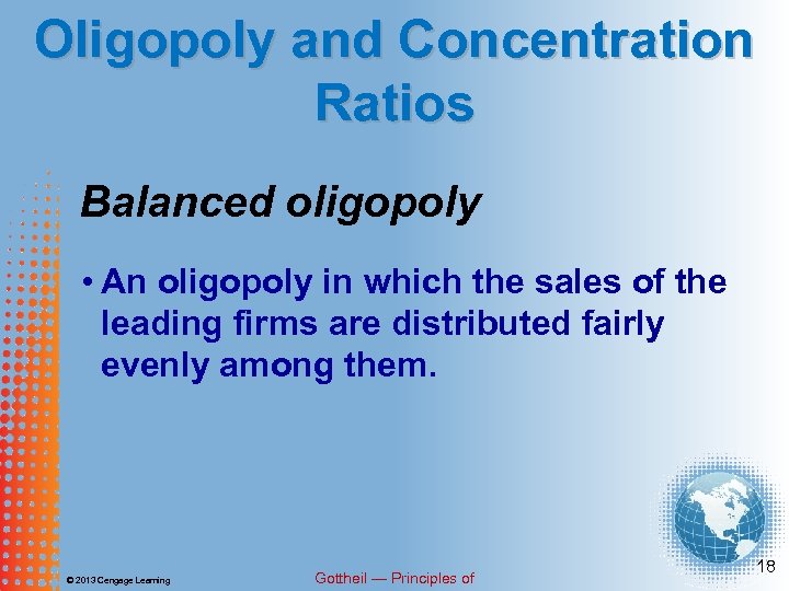 Oligopoly and Concentration Ratios Unbalanced oligopoly • An oligopoly in which the sales of the leading firms are distributed unevenly among them. © 2013 Cengage Learning Gottheil — Principles of 17