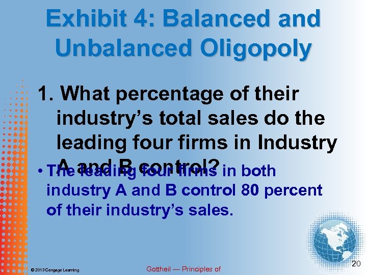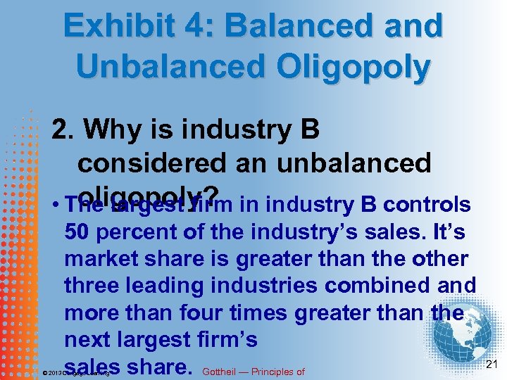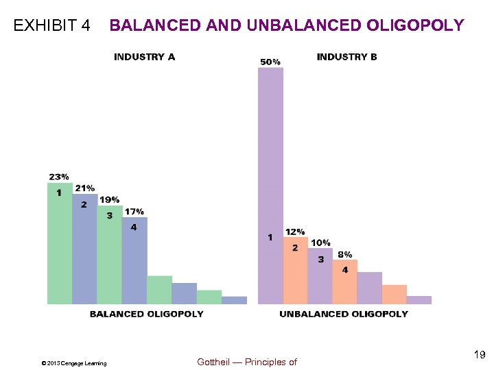 Exhibit 4: Balanced and Unbalanced Oligopoly 1. What percentage of their industry’s total sales do the leading four firms in Industry A leading four firms • The and B control? in both industry A and B control 80 percent of their industry’s sales. © 2013 Cengage Learning Gottheil — Principles of 20