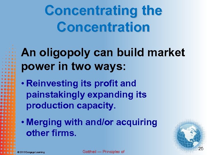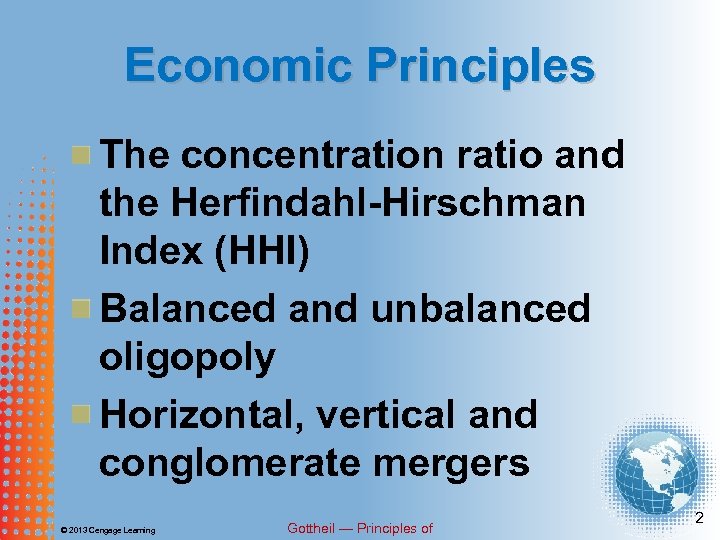Economic Principles The concentration ratio and the Herfindahl-Hirschman Index (HHI) Balanced and unbalanced oligopoly Horizontal, vertical and conglomerate mergers © 2013 Cengage Learning Gottheil — Principles of 2