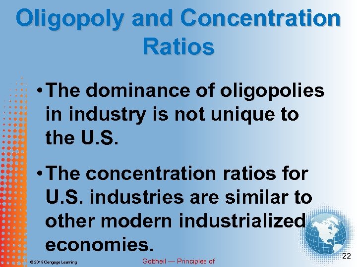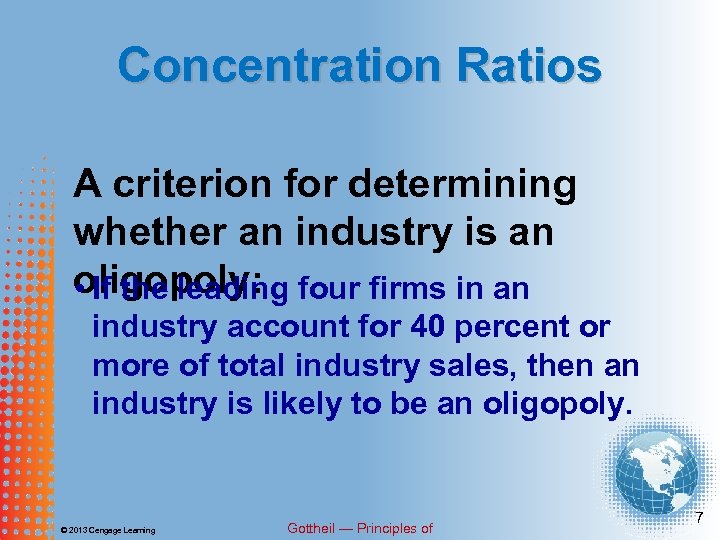 Concentration Ratios A criterion for determining whether an industry is an oligopoly: four firms in an • If the leading industry account for 40 percent or more of total industry sales, then an industry is likely to be an oligopoly. © 2013 Cengage Learning Gottheil — Principles of 7