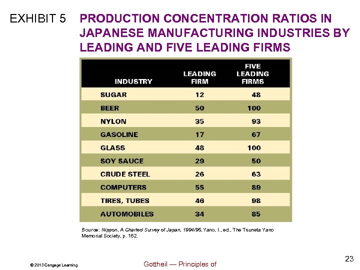 EXHIBIT 5 PRODUCTION CONCENTRATION RATIOS IN JAPANESE MANUFACTURING INDUSTRIES BY LEADING AND FIVE LEADING FIRMS Source: Nippon, A Charted Survey of Japan, 1994/95, Yano, I. , ed. , The Tsuneta Yano Memorial Society, p. 162. © 2013 Cengage Learning Gottheil — Principles of 23