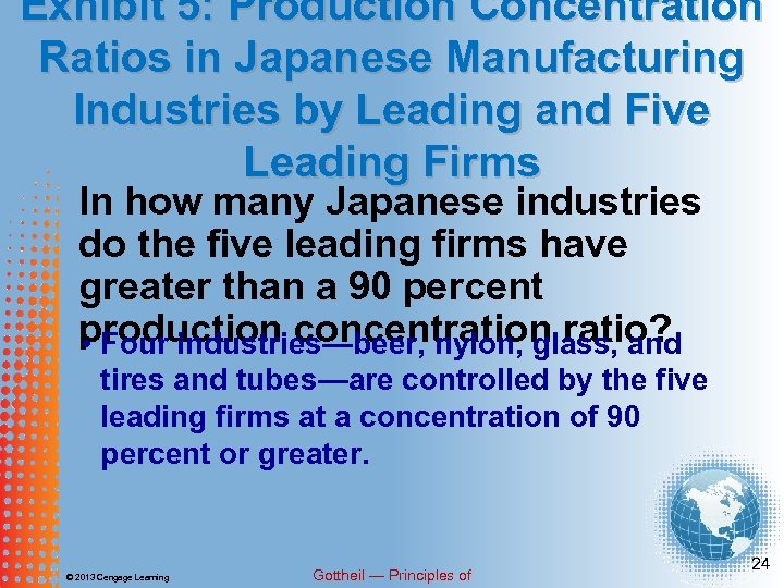 Exhibit 5: Production Concentration Ratios in Japanese Manufacturing Industries by Leading and Five Leading Firms In how many Japanese industries do the five leading firms have greater than a 90 percent production concentration ratio? • Four industries—beer, nylon, glass, and tires and tubes—are controlled by the five leading firms at a concentration of 90 percent or greater. © 2013 Cengage Learning Gottheil — Principles of 24