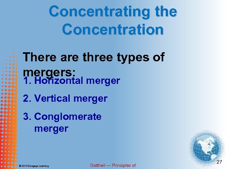 Concentrating the Concentration There are three reasons why firms merge: 1. To exercise greater market control. 2. To increase control over the supplies of their inputs or the buyers of their goods. 3. To expand diversify their asset holdings. © 2013 Cengage Learning Gottheil — Principles of 26