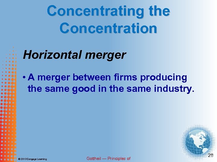 Concentrating the Concentration There are three types of mergers: 1. Horizontal merger 2. Vertical merger 3. Conglomerate merger © 2013 Cengage Learning Gottheil — Principles of 27