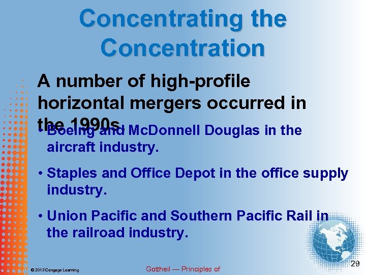 Concentrating the Concentration A number of high-profile horizontal mergers occurred in the 1990 s. Mc. Donnell Douglas in the • Boeing and aircraft industry. • Staples and Office Depot in the office supply industry. • Union Pacific and Southern Pacific Rail in the railroad industry. © 2013 Cengage Learning Gottheil — Principles of 29