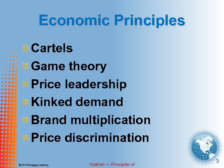 Economic Principles Cartels Game theory Price leadership Kinked demand Brand multiplication Price discrimination © 2013 Cengage Learning Gottheil — Principles of 3