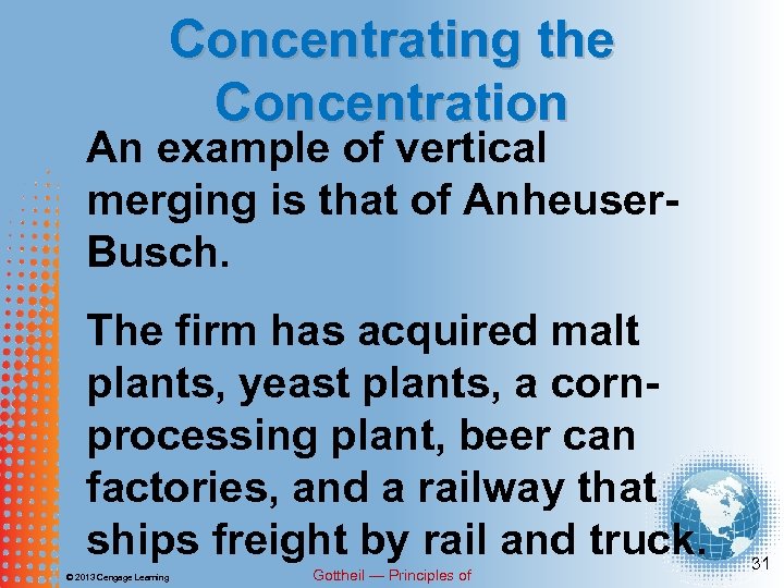 Concentrating the Concentration An example of vertical merging is that of Anheuser. Busch. The firm has acquired malt plants, yeast plants, a cornprocessing plant, beer can factories, and a railway that ships freight by rail and truck. © 2013 Cengage Learning Gottheil — Principles of 31