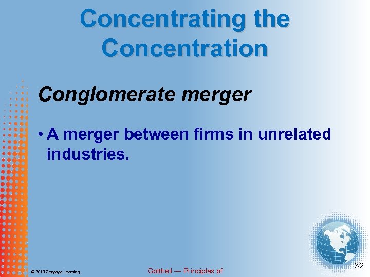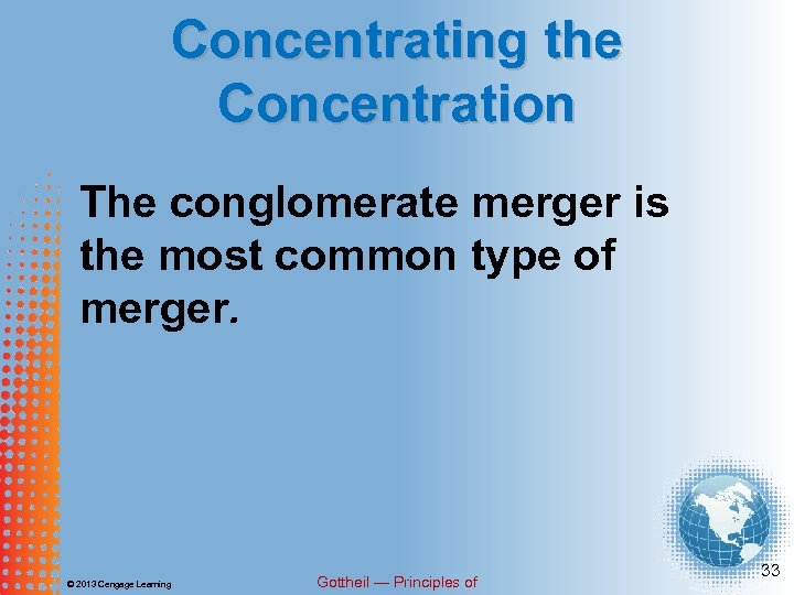 Concentrating the Concentration Conglomerate merger • A merger between firms in unrelated industries. © 2013 Cengage Learning Gottheil — Principles of 32