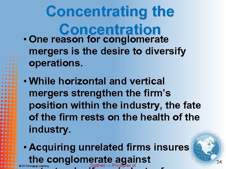 Concentrating the Concentration The conglomerate merger is the most common type of merger. © 2013 Cengage Learning Gottheil — Principles of 33