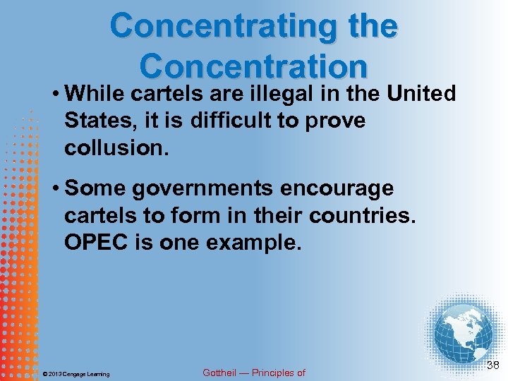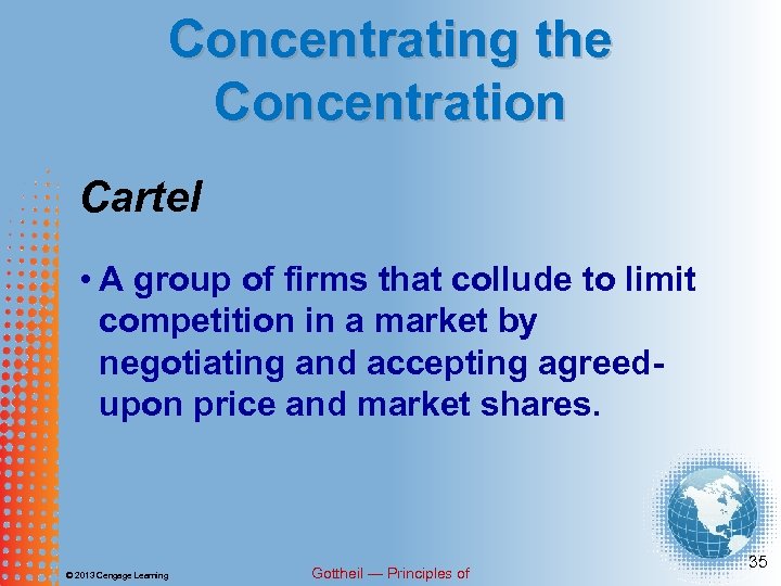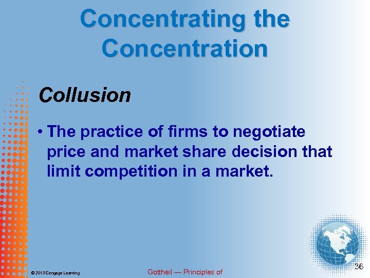 Concentrating the Concentration Cartel • A group of firms that collude to limit competition in a market by negotiating and accepting agreedupon price and market shares. © 2013 Cengage Learning Gottheil — Principles of 35