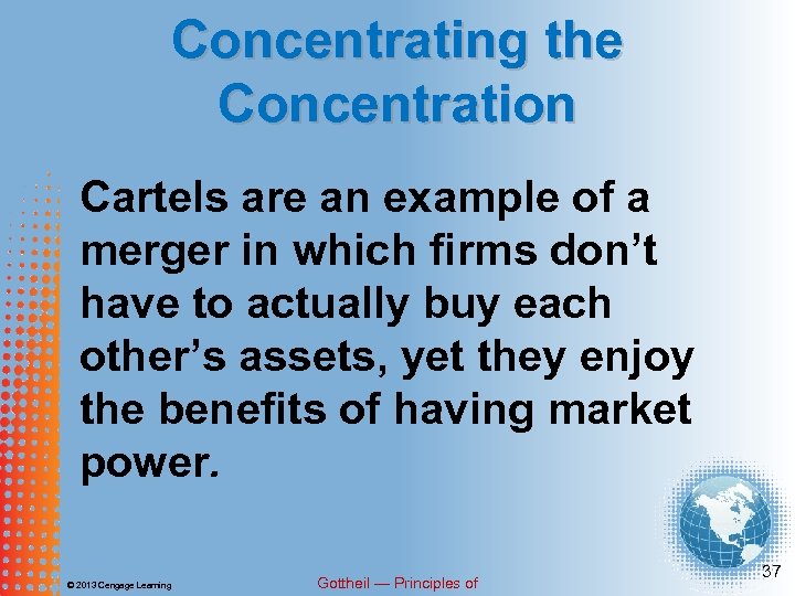 Concentrating the Concentration Cartels are an example of a merger in which firms don’t have to actually buy each other’s assets, yet they enjoy the benefits of having market power. © 2013 Cengage Learning Gottheil — Principles of 37