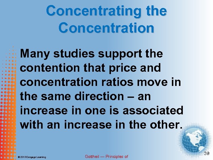 Concentrating the Concentration Many studies support the contention that price and concentration ratios move in the same direction – an increase in one is associated with an increase in the other. © 2013 Cengage Learning Gottheil — Principles of 39