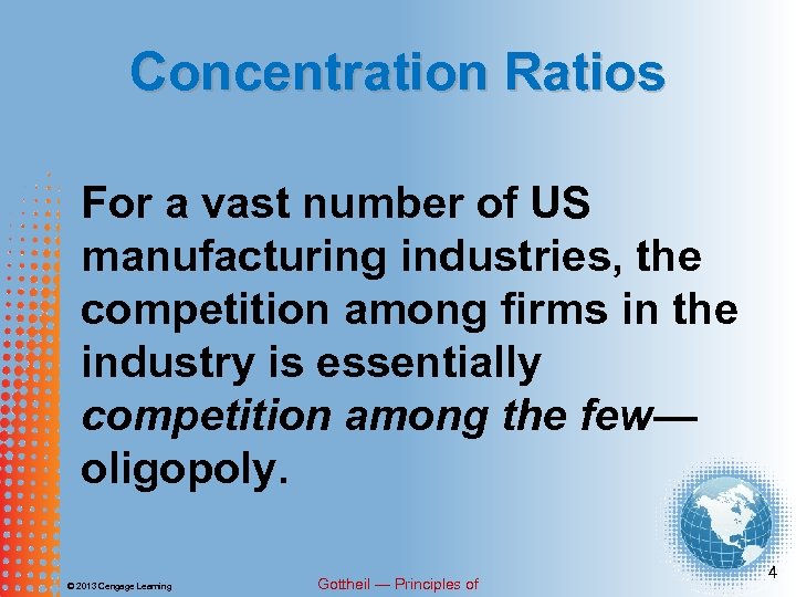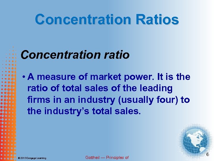 Concentration Ratios An industry may consist of many firms, but if only a few of the many dominate the industry, then the industry is oligopolistic. © 2013 Cengage Learning Gottheil — Principles of 5