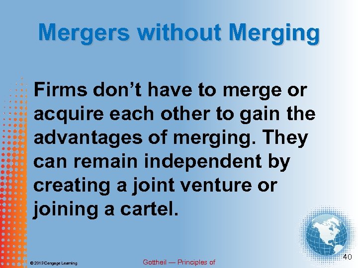 Mergers without Merging Firms don’t have to merge or acquire each other to gain the advantages of merging. They can remain independent by creating a joint venture or joining a cartel. © 2013 Cengage Learning Gottheil — Principles of 40