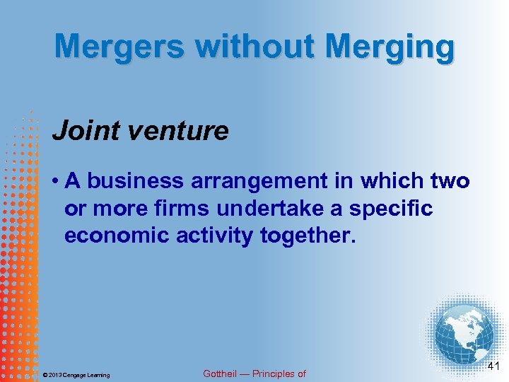 Mergers without Merging Joint venture • A business arrangement in which two or more firms undertake a specific economic activity together. © 2013 Cengage Learning Gottheil — Principles of 41