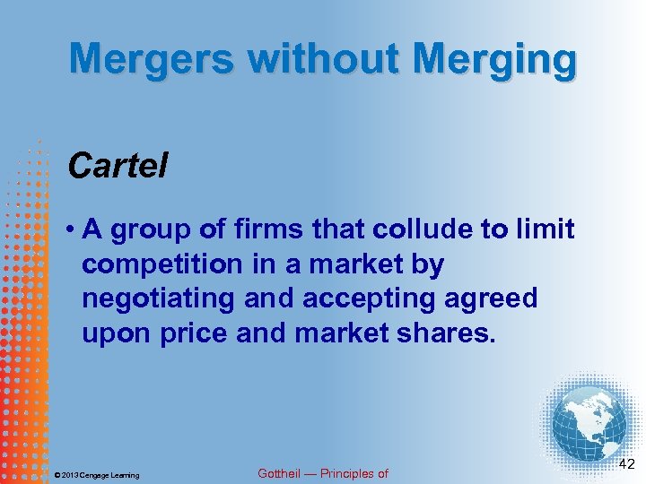 Mergers without Merging Cartel • A group of firms that collude to limit competition in a market by negotiating and accepting agreed upon price and market shares. © 2013 Cengage Learning Gottheil — Principles of 42