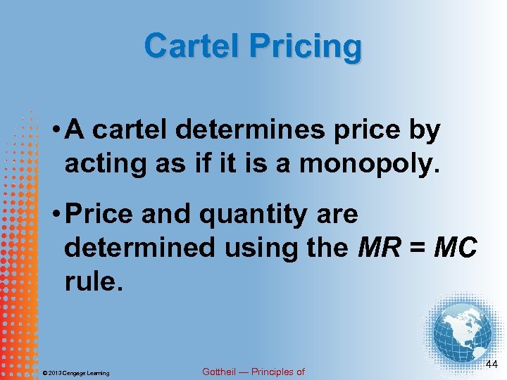 Cartel Pricing • A cartel determines price by acting as if it is a monopoly. • Price and quantity are determined using the MR = MC rule. © 2013 Cengage Learning Gottheil — Principles of 44