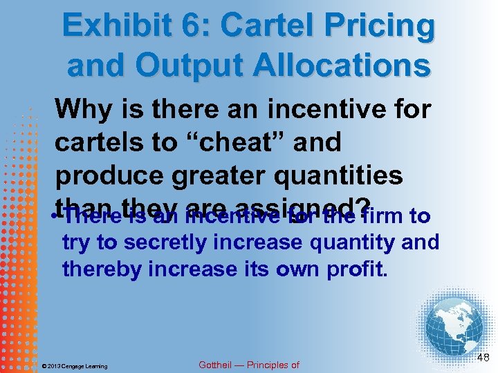 Exhibit 6: Cartel Pricing and Output Allocations Why is there an incentive for cartels to “cheat” and produce greater quantities than they are assigned? and quantity assigned to • The price individual firms within the cartel may not coincide with where the firm would maximize profit using its own MR and MC curves. © 2013 Cengage Learning Gottheil — Principles of 47