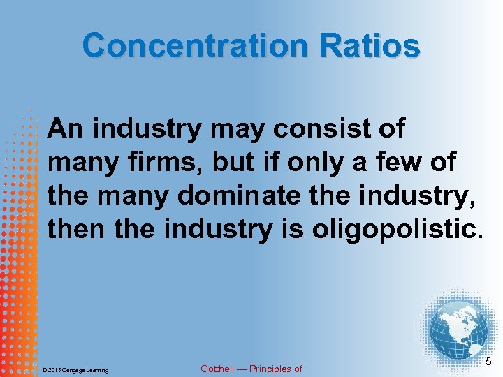 Concentration Ratios For a vast number of US manufacturing industries, the competition among firms in the industry is essentially competition among the few— oligopoly. © 2013 Cengage Learning Gottheil — Principles of 4