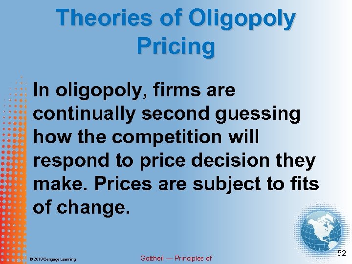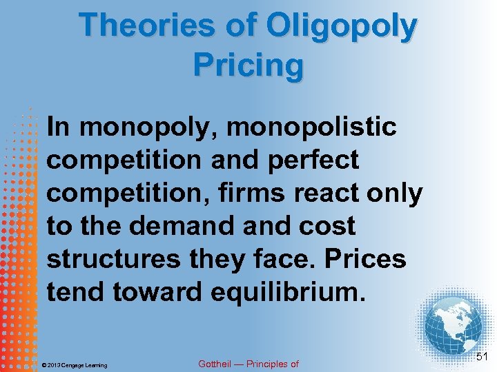 Theories of Oligopoly Pricing In monopoly, monopolistic competition and perfect competition, firms react only to the demand cost structures they face. Prices tend toward equilibrium. © 2013 Cengage Learning Gottheil — Principles of 51