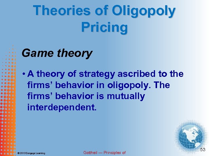 Theories of Oligopoly Pricing In oligopoly, firms are continually second guessing how the competition will respond to price decision they make. Prices are subject to fits of change. © 2013 Cengage Learning Gottheil — Principles of 52