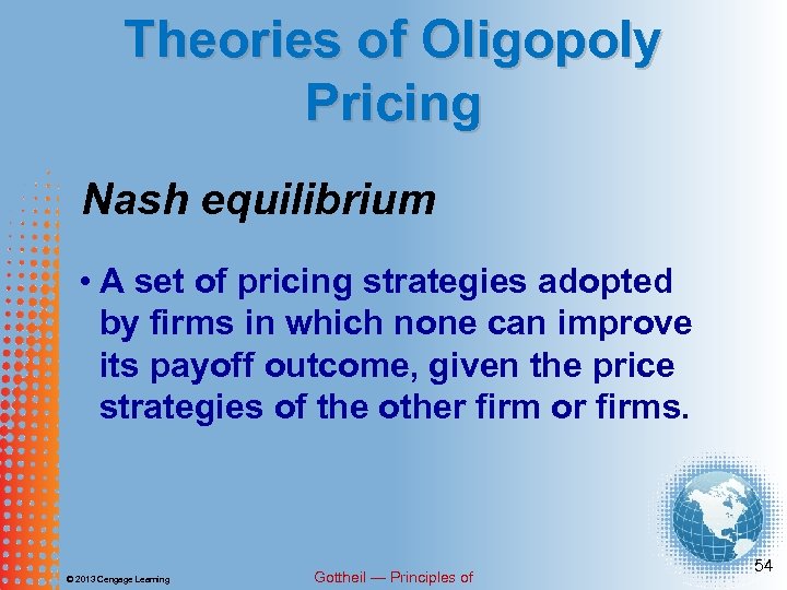 Theories of Oligopoly Pricing Game theory • A theory of strategy ascribed to the firms’ behavior in oligopoly. The firms’ behavior is mutually interdependent. © 2013 Cengage Learning Gottheil — Principles of 53