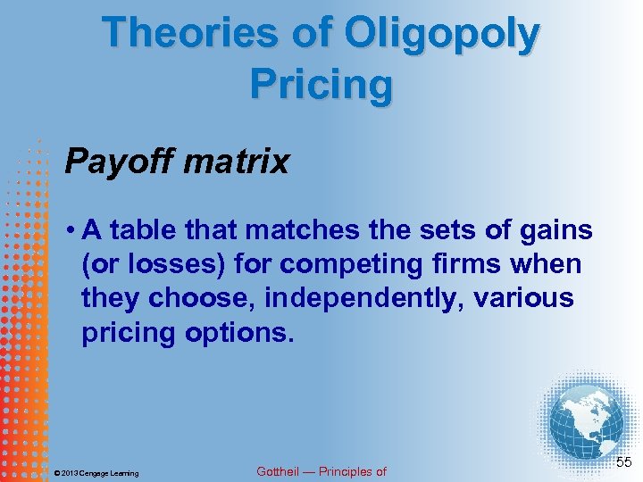 Theories of Oligopoly Pricing Payoff matrix • A table that matches the sets of gains (or losses) for competing firms when they choose, independently, various pricing options. © 2013 Cengage Learning Gottheil — Principles of 55