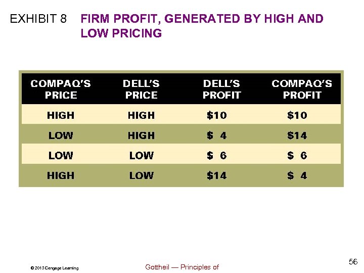 EXHIBIT 8 © 2013 Cengage Learning FIRM PROFIT, GENERATED BY HIGH AND LOW PRICING Gottheil — Principles of 56