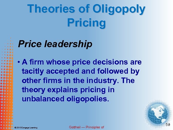 Theories of Oligopoly Pricing Price leadership • A firm whose price decisions are tacitly accepted and followed by other firms in the industry. The theory explains pricing in unbalanced oligopolies. © 2013 Cengage Learning Gottheil — Principles of 59
