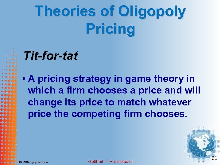 Theories of Oligopoly Pricing Tit-for-tat • A pricing strategy in game theory in which a firm chooses a price and will change its price to match whatever price the competing firm chooses. © 2013 Cengage Learning Gottheil — Principles of 60
