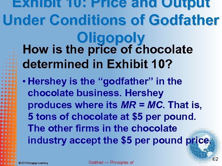 Exhibit 10: Price and Output Under Conditions of Godfather Oligopoly How is the price of chocolate determined in Exhibit 10? • Hershey is the “godfather” in the chocolate business. Hershey produces where its MR = MC. That is, 5 tons of chocolate at $5 per pound. The other firms in the chocolate industry accept the $5 per pound price. © 2013 Cengage Learning Gottheil — Principles of 62