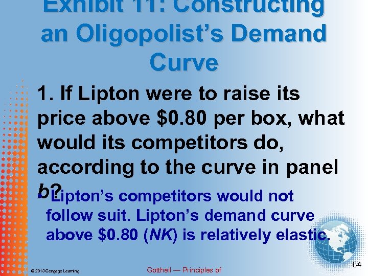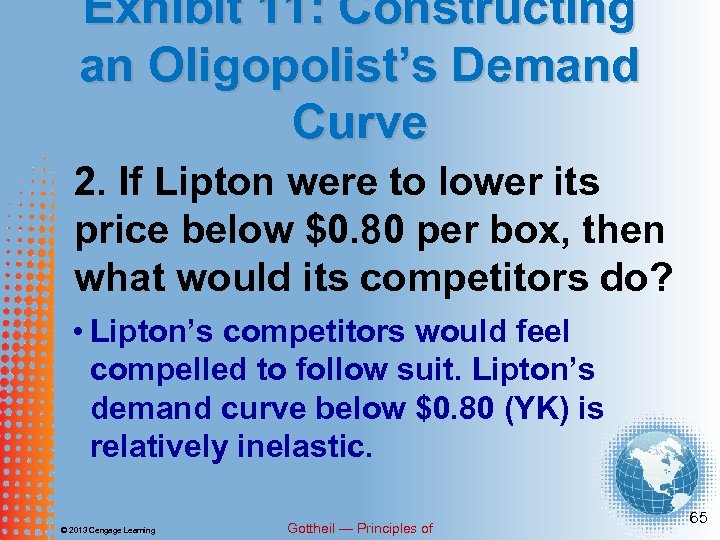 Exhibit 11: Constructing an Oligopolist’s Demand Curve 1. If Lipton were to raise its price above $0. 80 per box, what would its competitors do, according to the curve in panel b? • Lipton’s competitors would not follow suit. Lipton’s demand curve above $0. 80 (NK) is relatively elastic. © 2013 Cengage Learning Gottheil — Principles of 64