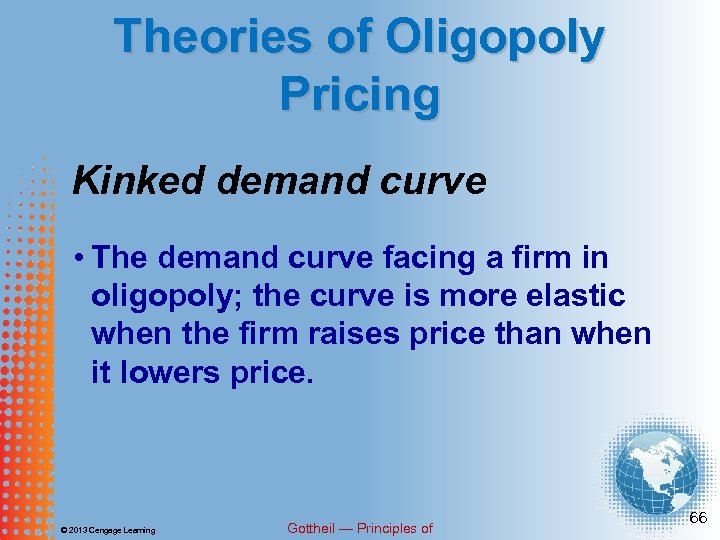 Theories of Oligopoly Pricing Kinked demand curve • The demand curve facing a firm in oligopoly; the curve is more elastic when the firm raises price than when it lowers price. © 2013 Cengage Learning Gottheil — Principles of 66