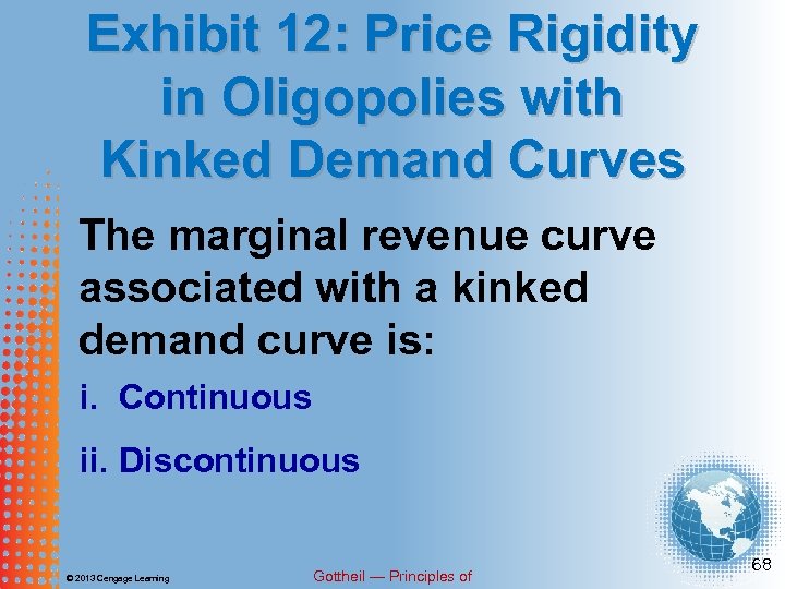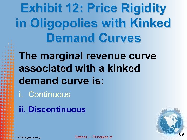 Exhibit 12: Price Rigidity in Oligopolies with Kinked Demand Curves The marginal revenue curve associated with a kinked demand curve is: i. Continuous ii. Discontinuous © 2013 Cengage Learning Gottheil — Principles of 68