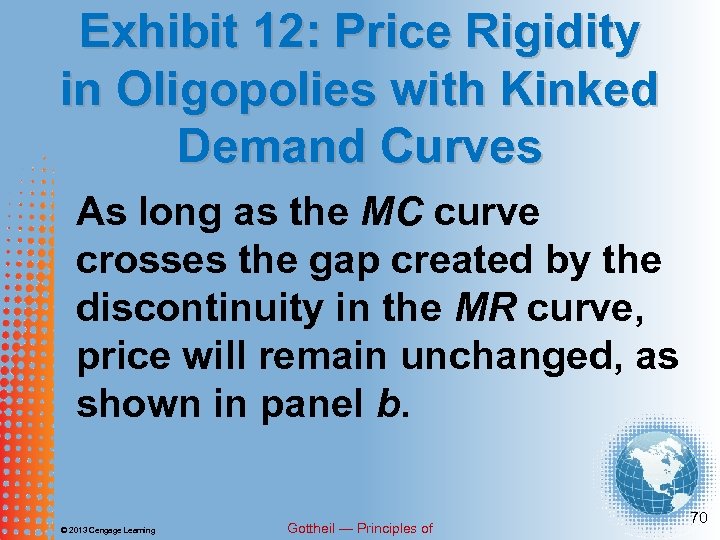 Exhibit 12: Price Rigidity in Oligopolies with Kinked Demand Curves The marginal revenue curve associated with a kinked demand curve is: i. Continuous ii. Discontinuous © 2013 Cengage Learning Gottheil — Principles of 69