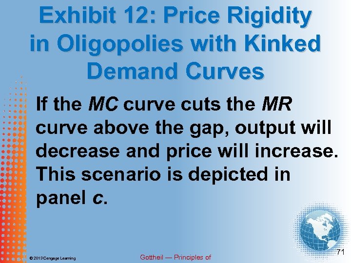 Exhibit 12: Price Rigidity in Oligopolies with Kinked Demand Curves As long as the MC curve crosses the gap created by the discontinuity in the MR curve, price will remain unchanged, as shown in panel b. © 2013 Cengage Learning Gottheil — Principles of 70