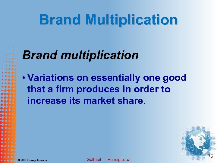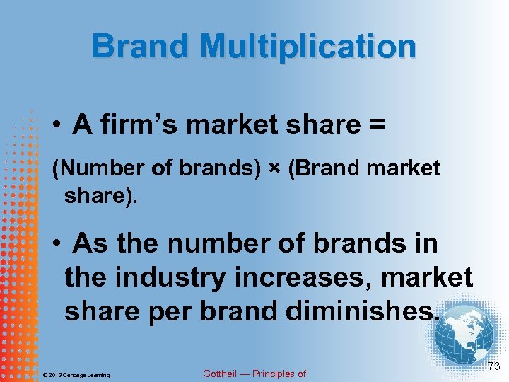 Brand Multiplication Brand multiplication • Variations on essentially one good that a firm produces in order to increase its market share. © 2013 Cengage Learning Gottheil — Principles of 72