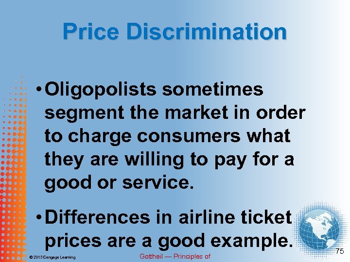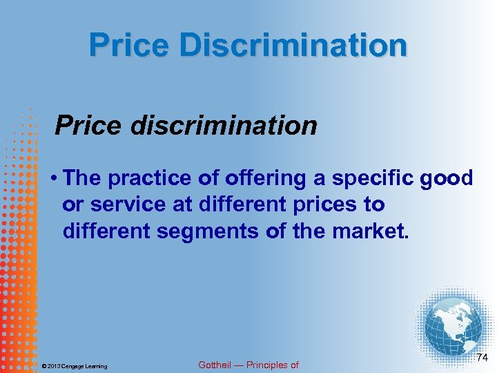 Price Discrimination Price discrimination • The practice of offering a specific good or service at different prices to different segments of the market. © 2013 Cengage Learning Gottheil — Principles of 74