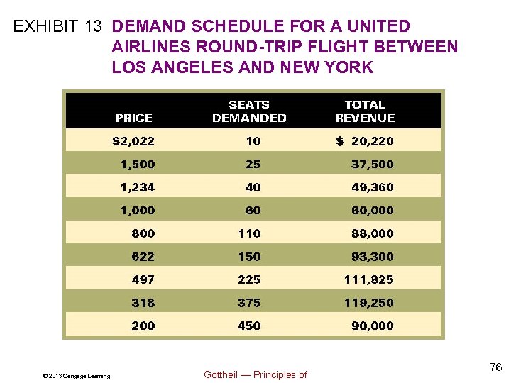 EXHIBIT 13 DEMAND SCHEDULE FOR A UNITED AIRLINES ROUND-TRIP FLIGHT BETWEEN LOS ANGELES AND NEW YORK © 2013 Cengage Learning Gottheil — Principles of 76