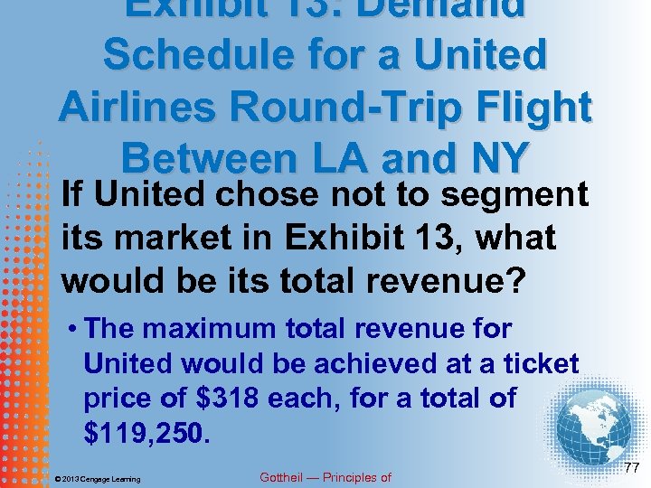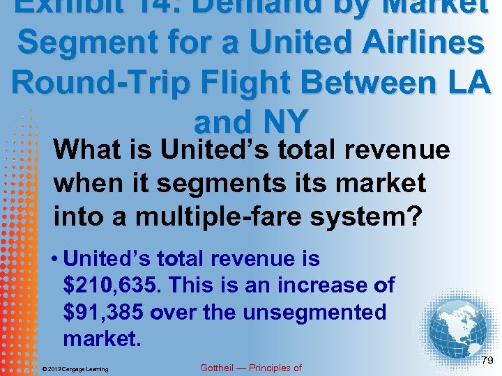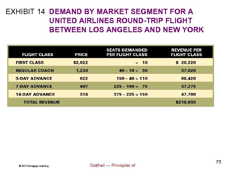 Exhibit 13: Demand Schedule for a United Airlines Round-Trip Flight Between LA and NY If United chose not to segment its market in Exhibit 13, what would be its total revenue? • The maximum total revenue for United would be achieved at a ticket price of $318 each, for a total of $119, 250. © 2013 Cengage Learning Gottheil — Principles of 77