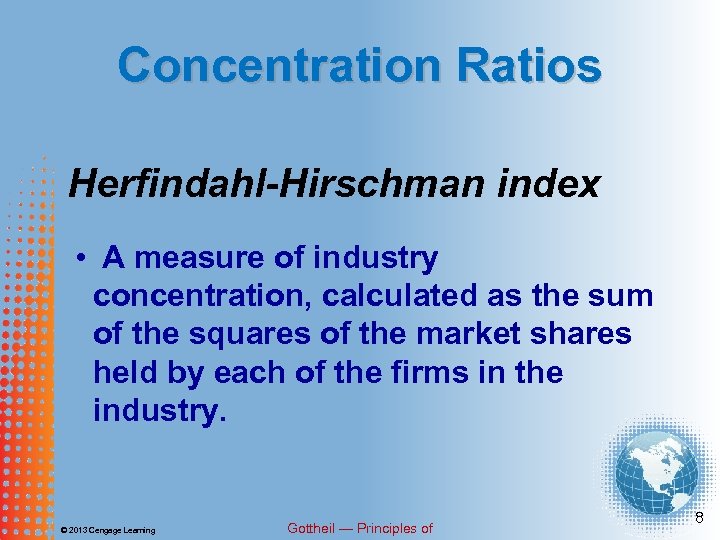 Concentration Ratios Herfindahl-Hirschman index • A measure of industry concentration, calculated as the sum of the squares of the market shares held by each of the firms in the industry. © 2013 Cengage Learning Gottheil — Principles of 8